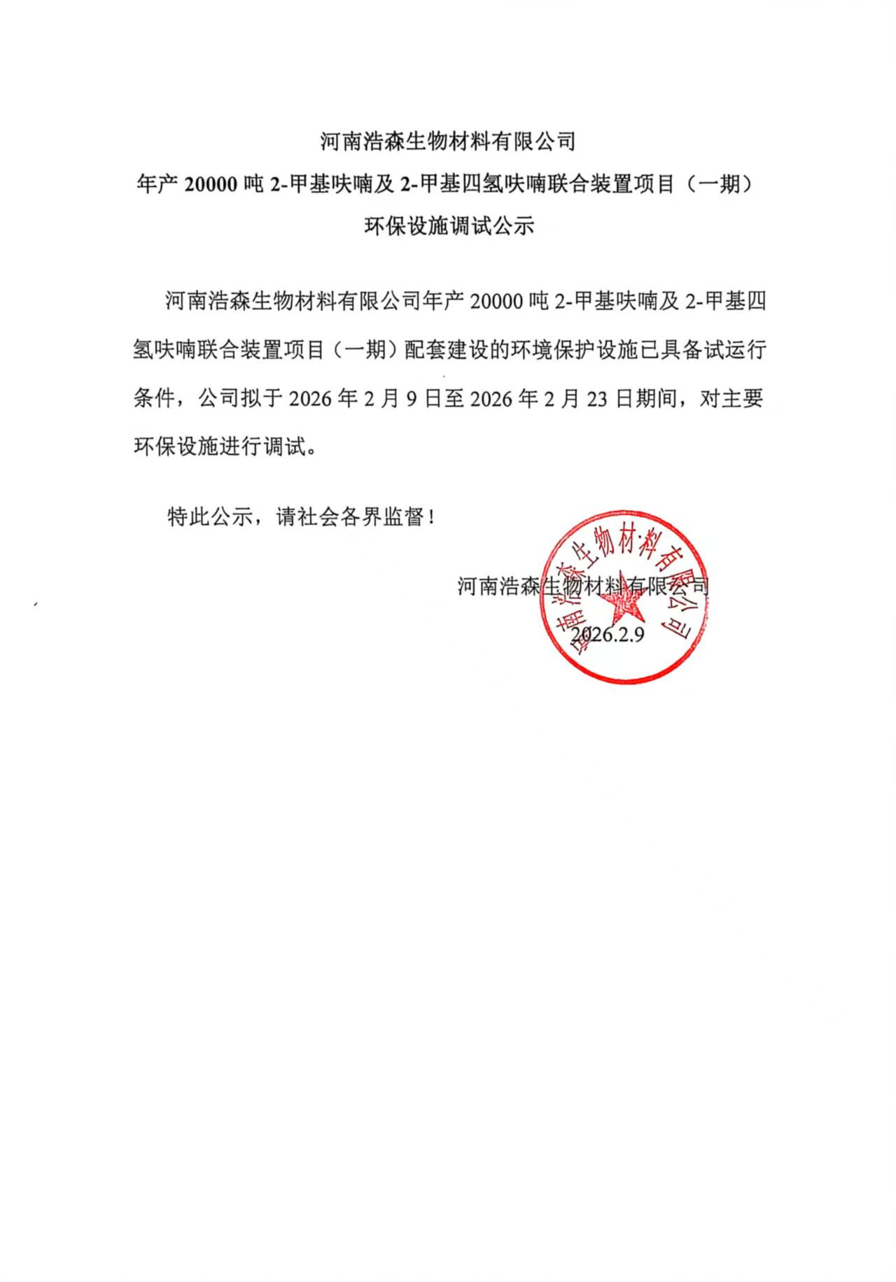 河南浩森生物材料有限公司 年產20000噸2-甲基呋喃及2-甲基四氫呋喃聯(lián)合裝置項目(一期) 環(huán)保設施調試公示